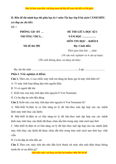 II. Bốn đề thi minh họa thi giữa học kì 1 môn Tin học lớp 8 bộ sách CÁNH DIỀU