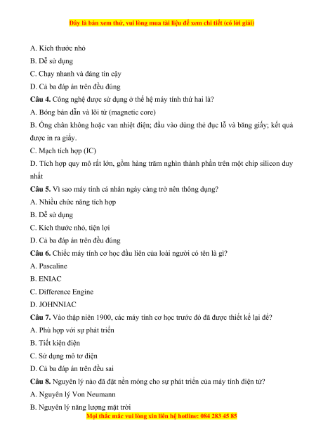 Câu 6. Chiếc máy tính cơ học đầu liên của loài người có tên là gì? A. Pascaline B. ENIAC C. Difference Engine D. JOHNNIAC