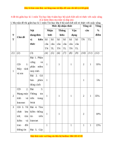 vị kiến Số Số Số Số Số Số TN TL thức câu câu câu câu câu câu TN TL TN TL TN TL (1) (2) (3) (4) (5) (6) (7) (8) (9) (10) (11) (12) Bài 1. Phần cứng và CĐ 1: 1 1 1 2 1 35% phần mềm Máy tính 1 máy tính và em Bài 2. Gõ bàn phím 1 1 5% đúng cách CĐ 2. Bài 3. Mạng máy Thông tin 2 1 1 1 2 1 35% tính và trên trang Internet Web 3 CĐ 3. Tổ Bài 4. Tìm chức lưu kiếm thông 1 1 2 10% trữ, tìm tin trên kiếm và Internet trao đổi 1 1 1 1 15% thông tin Bài 5. Cây
