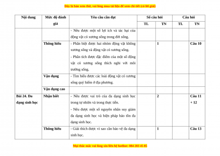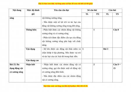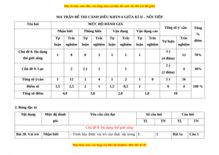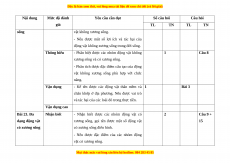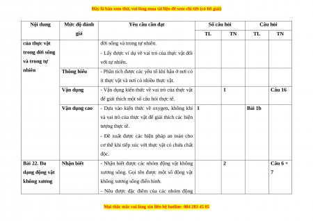 Chủ đề 8. Đa dạng 3 ý 1 8 0 3 1 1 1 12 70% thế giới sống (4 điểm) 2 ý Chủ đề 9. Lực 2 2 ý 1 1 4 30% (2 điểm) Tổng số ý/câu 1 12 2 4 1 2 1 0 5 ý 16 Điểm số 1,5 2,5 2 1 1,5 0,5 1 6 4 100 % Tổng số điểm 4,0 3,0 2,0 1,0 10 2. Bảng đặc tả Nội dung Mức độ đánh Yêu cầu cần đạt Số câu hỏi Câu hỏi giá TL TN TL TN