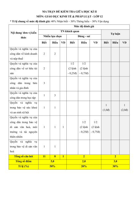 Nội dung/ đơn vị kiến TN khách quan Tự luận thức Nhiều lựa chọn Đúng - sai Biết Hiểu VD Biết Hiểu VD Biết Hiểu VD Quyền và nghĩa vụ của công dân về kinh doanh 2 2 và nộp thuế Quyền và nghĩa vụ của 1/2 1/2