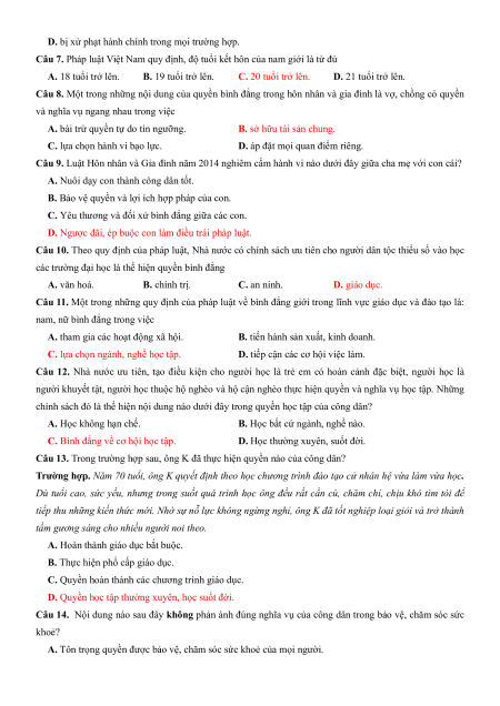 Câu 7. Pháp luật Việt Nam quy định, độ tuổi kết hôn của nam giới là từ đủ