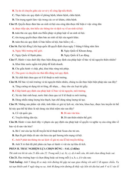 Câu 15. Quyền được đảm bảo an sinh xã hội của công dân được thể hiện ở việc công dân