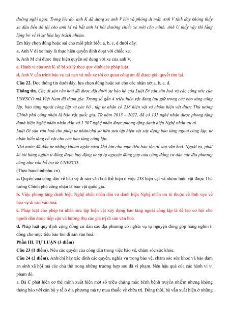 Câu 20. Hành vi nào dưới đây vi phạm các quy định của pháp luật về quyền và nghĩa vụ của công dân về bảo vệ di sản văn hóa?