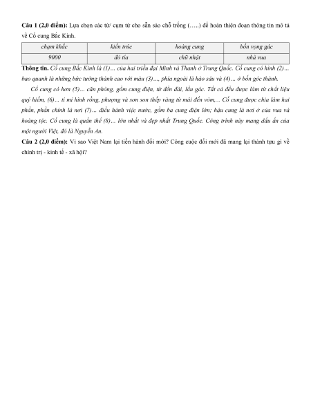 Câu 1 (2,0 điểm): Lựa chọn các từ/ cụm từ cho sẵn sào chỗ trống (…. ) để hoàn thiện đoạn thông tin mô tả về Cố cung Bắc Kinh. chạm khắc kiến trúc hoàng cung bốn vọng gác 9000 đỏ tía chữ nhật nhà vua