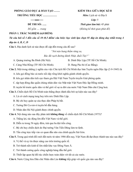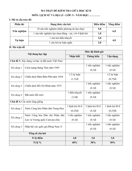 MÔN: LỊCH SỬ VÀ ĐỊA LÍ - LỚP: 5 - NĂM HỌC: …………