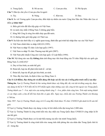 Câu 7. Dân tộc chủ yếu ở Cam-pu-chia là người A. Tày. B. Nùng. C. Khơ-me. D. Dao.
