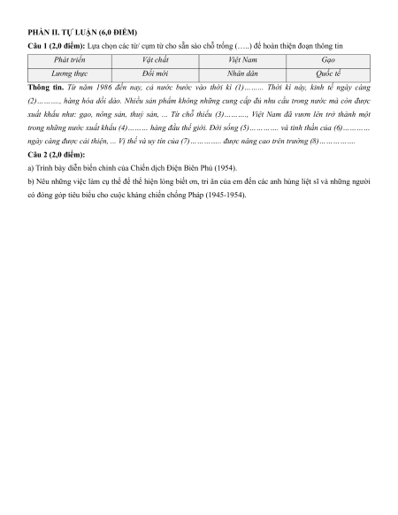 Câu 1 (2,0 điểm): Lựa chọn các từ/ cụm từ cho sẵn sào chỗ trống (…. ) để hoàn thiện đoạn thông tin Phát triển Vật chất Việt Nam Gạo Lương thực Đổi mới Nhân dân Quốc tế