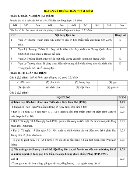 Nội dung 2 Chiến dịch Điện Biên Phủ năm 1954 (1,25đ) (0,75đ) 1 trắc nghiệm 1 trắc nghiệm
