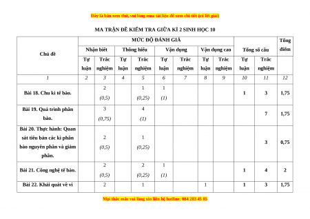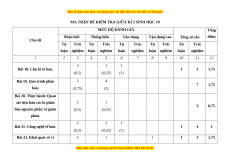 MA TRẬN ĐỀ KIỂM TRA GIỮA KÌ 2 SINH HỌC 10 MỨC ĐỘ ĐÁNH GIÁ Tổng Nhận biết Thông hiểu Vận dụng Vận dụng cao Tổng số câu điểm Chủ đề Tự Trắc Tự Trắc Tự Trắc Tự Trắc Tự Trắc luận nghiệm luận nghiệm luận nghiệm luận nghiệm luận nghiệm 1 2 3 4 5 6 7 8 9 10 11 12 2 1 1