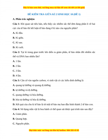 ĐỀ KIỂM TRA GIỮA KÌ 2 SINH HỌC 10 (ĐỀ 1)