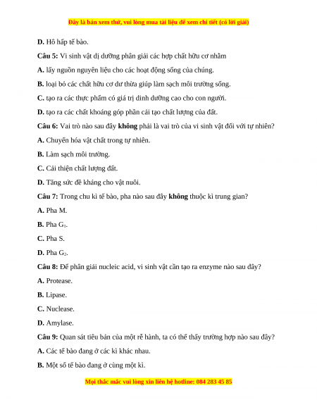 Câu 7: Trong chu kì tế bào, pha nào sau đây không thuộc kì trung gian? A. Pha M. B. Pha G1. C. Pha S. D. Pha G2.