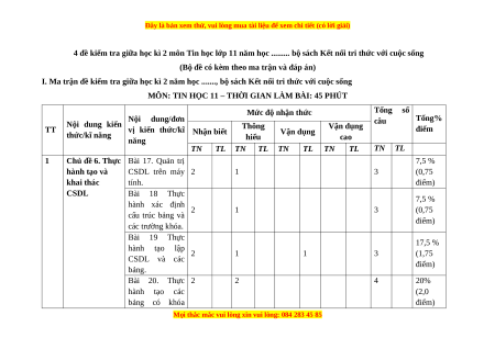 4 đề kiểm tra giữa học kì 2 môn Tin học lớp 11 năm học ......... bộ sách Kết nối tri thức với cuộc sống