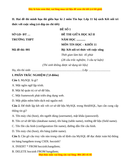 II. Hai đề thi minh họa thi giữa học kì 2 môn Tin học Lớp 11 bộ sách Kết nối tri