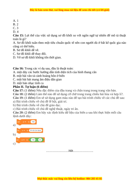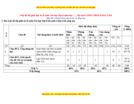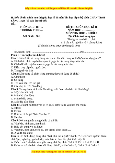 II. Bốn đề thi minh họa thi giữa học kì II môn Tin học lớp 8 bộ sách CHÂN TRỜI
