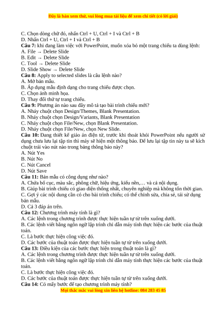 Câu 7: khi đang làm việc với PowerPoint, muốn xóa bỏ một trang chiếu ta dùng lệnh: A. File → Delete Slide B. Edit → Delete Slide C. Tool → Delete Slide D. Slide Show → Delete Slide
