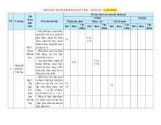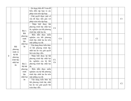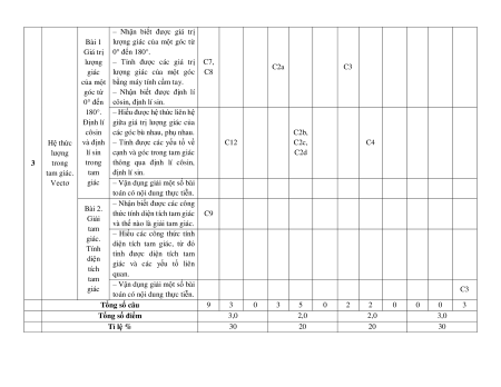 Trả lời ngắn Vận Vận Vận Vận Vận Biết Hiểu Biết Hiểu Biết Hiểu Biết Hiểu Biết Hiểu dụng dụng dụng dụng dụng Bài 1. Mệnh đề 1 1 2 2 3 3 15 toán học Mệnh đề Bài 2. Tập 1 toán học. hợp. Các Tập hợp phép toán 2 1 1 3 1 20 trên tập hợp Bất Bài 1. Bất phương phương 1 1 1 1 2 10 trình và trình bậc hệ bất nhất hai ẩn 2 phương Bài 2. Hệ trình bậc bất phương 2 1 2 1 15 nhất hai trình bậc ẩn nhất hai ẩn Bài 1. Giá Hệ thức trị lượng lượng giác của 3 trong một góc từ 2 1 1 3 1 1 4 5 27,5 tam giác. 0° đến Vectơ 180°. Định lí côsin và định lí sin trong tam giác Bài 2. Giải tam giác. Tính diện 1 1 1 1 12,5 tích tam giác Tổng số câu 9 3 0 3 5 0 2 2 0 0 0 3 14 10 3 Tổng số điểm 3,0 2,0 2,0 3,0 4,0 3,0 3,0 10 Tỉ lệ % 30 20 20 30 40 30 30 100 Lưu ý: