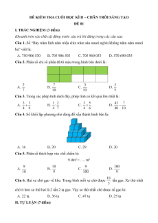 Câu 1. Số “Bảy trăm linh năm triệu chín trăm sáu mươi nghìn không trăm năm mươi ba” viết là: A. 750 906 530 B. 705 906 503 C. 705 960 053 D. 570 690 035