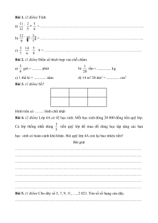 tròn số tự nhiên. điểm Các phép tính với số tự nhiên. Nhân (chia) với 10, 100, 1 000,... Nhân (chia) với số có 2 chữ số. Tìm số trung bình cộng. Bài toán liên quan đến rút về đơn vị. Phân số và Số câu 1 1 1 2 1 phép tính: Tính chất cơ bản của phân số. Rút gọn Số 0,5 0,5 0,5 1 0,5 phân số. Quy điểm đồng mẫu số các phân số. So sánh phân số. Phép cộng, trừ, nhân chia phân số. Tìm phân số của một số