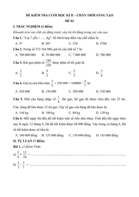 Câu 4. Giá trị của biểu thức 3 × 250 000 + 160000 : 4 là: 5 7 A. 430 000 B. 150 000 C. 280 000 D. 330 000