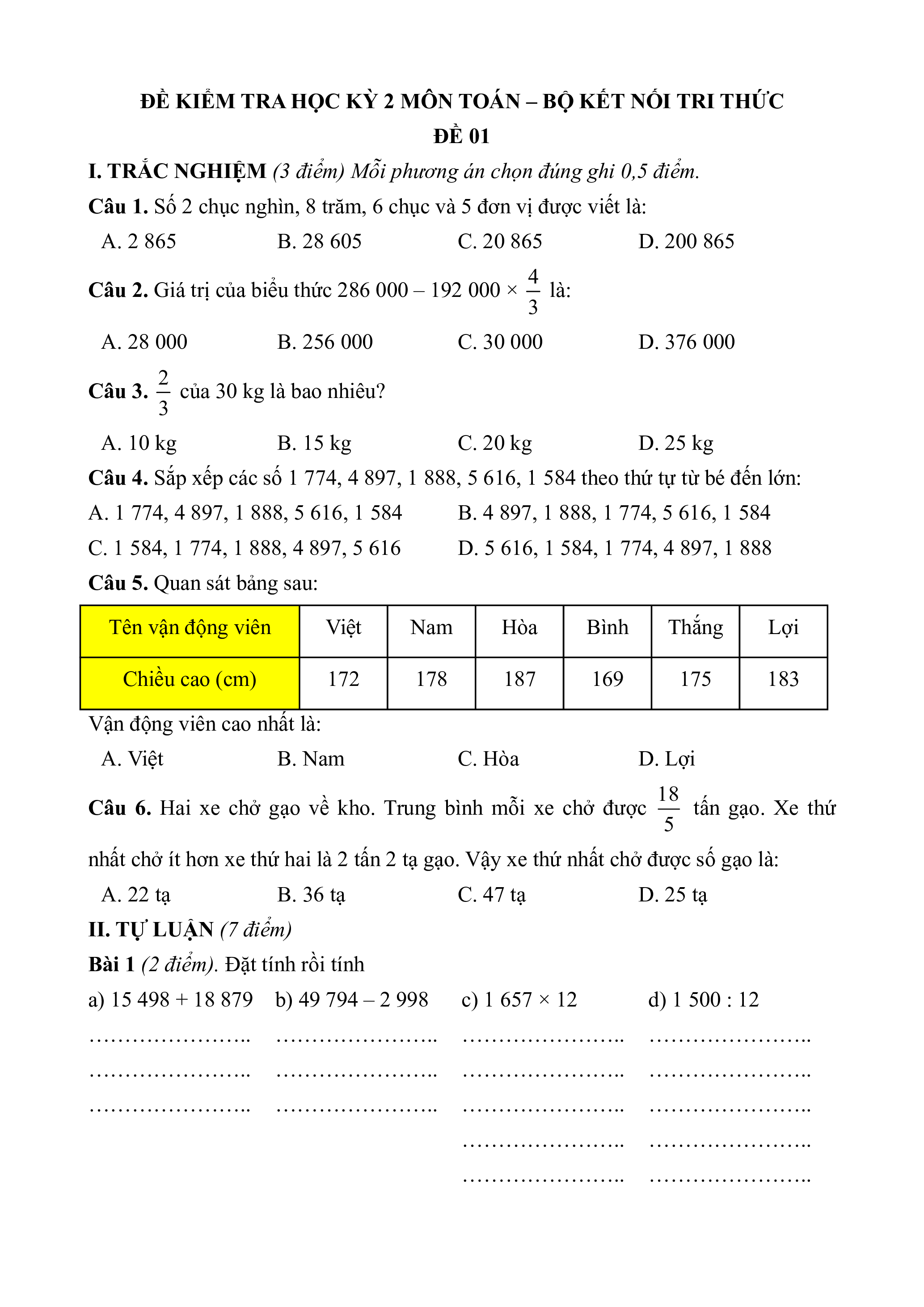 ĐỀ KIỂM TRA HỌC KỲ 2 MÔN TOÁN – BỘ KẾT NỐI TRI THỨC ĐỀ 01