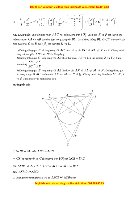 Câu 3. (3,0 điểm) Cho tam giác nhọn ABC nội tiếp đường tròn (O) . Các điểm E và F lần lượt nằm