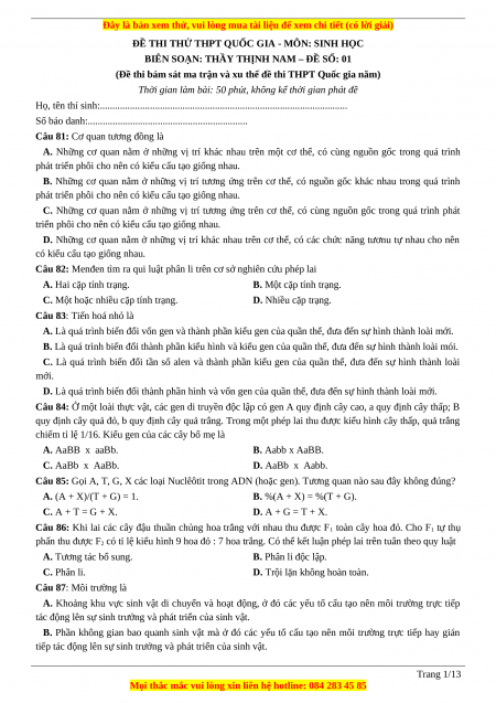 - Bộ 45 đề thi THPT Quốc gia môn Sinh Học năm 2022-2023 có lời giải chi tiết được thầy Thịnh Nam biên soạn công phu bám sát đề thi minh họa của Bộ GD&ĐT.