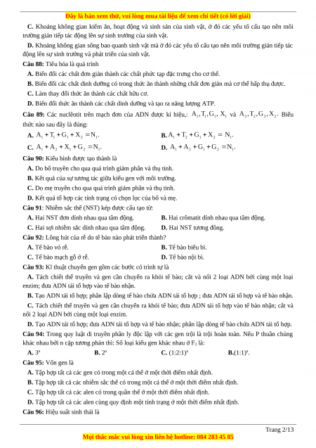 Câu 85: Gọi A, T, G, X các loại Nuclêôtit trong ADN (hoặc gen). Tương quan nào sau đây không đúng? A. (A + X)/(T + G) = 1. B. %(A + X) = %(T + G). C. A + T = G + X. D. A + G = T + X.
