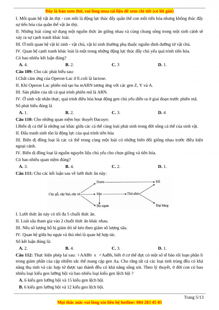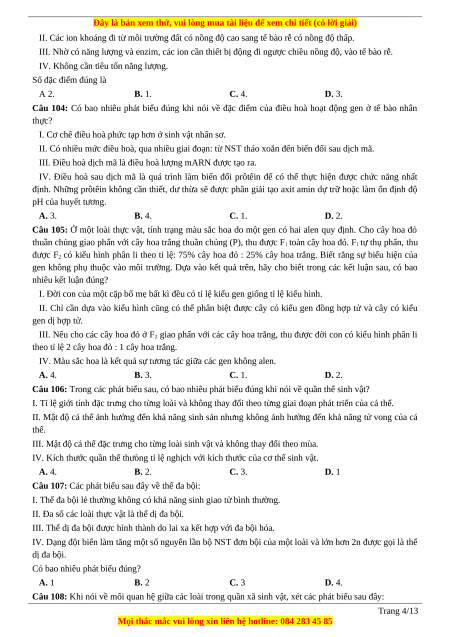 Câu 108: Khi nói về mối quan hệ giữa các loài trong quần xã sinh vật, xét các phát biểu sau đây: Trang 4/13