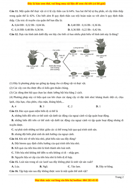 Câu 11. Một quần thể thực vật có tỉ lệ cây thân cao là 64%. Sau hai thế hệ tự thụ phấn, số cây thân thấp