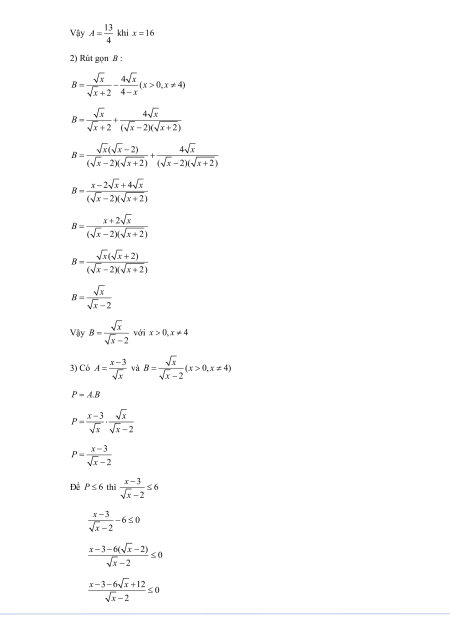 (x 0, x 4) x x − 2 P = . A B x − 3 = x P x x − 2 x − 3 P = x − 2 x − 3 Để P 6 thì 6 x − 2 x − 3 − 6 0 x − 2