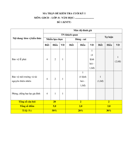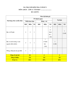 Nội dung/ đơn vị kiến thức Nhiều lựa chọn Đúng - sai Biết Hiểu VD Biết Hiểu VD Biết Hiểu VD 1 (4 1 Bảo vệ lễ phải 4 2 1 lệnh (2,0đ) hỏi - 1,0đ) 1