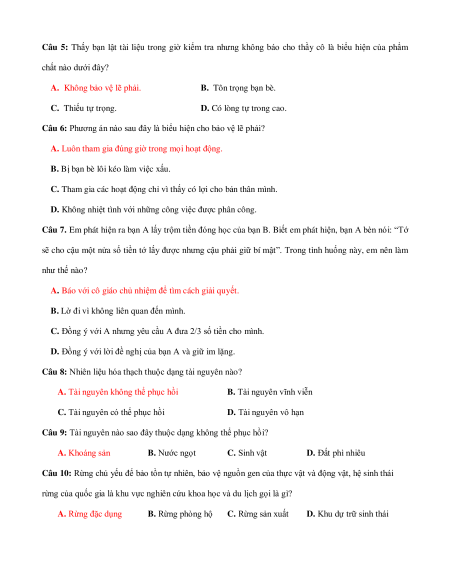 Câu 5: Thấy bạn lật tài liệu trong giờ kiểm tra nhưng không báo cho thầy cô là biểu hiện của phẩm