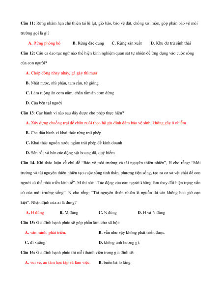 Câu 11: Rừng nhằm hạn chế thiên tai lũ lụt, gió bão, bảo vệ đất, chống xói mòn, góp phần bảo vệ môi