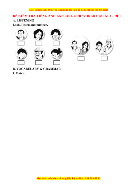 ĐỀ KIỂM TRA TIẾNG ANH EXPLORE OUR WORLD HỌC KÌ 2 – ĐỀ 1 A. LISTENING