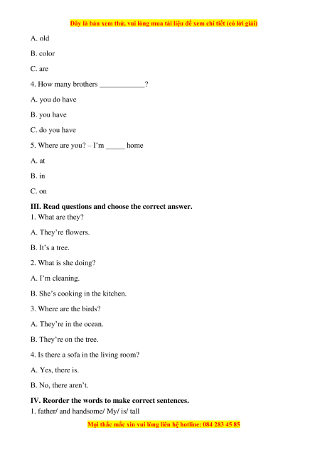 III. Read questions and choose the correct answer. 1. What are they? A. They’re flowers. B. It’s a tree. 2. What is she doing? A. I’m cleaning.