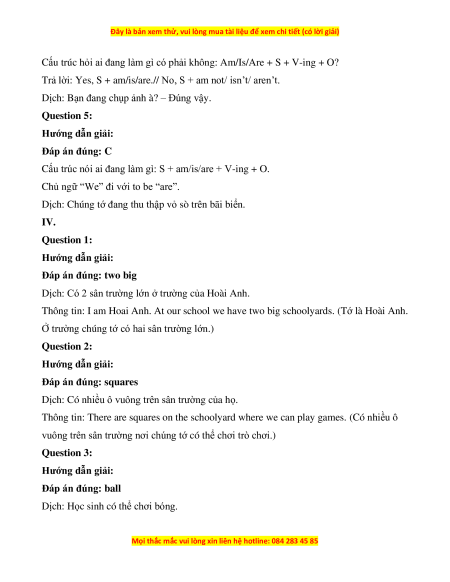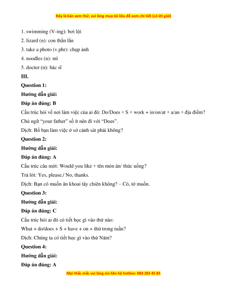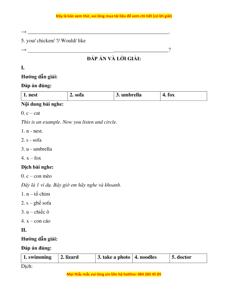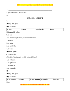 ĐÁP ÁN VÀ LỜI GIẢI: I. Hướng dẫn giải: Đáp án đúng: 1. nest 2. sofa 3. umbrella 4. fox Nội dung bài nghe: 0. c – cat