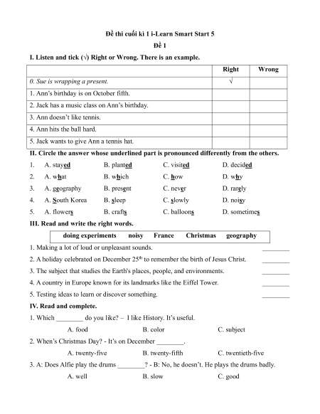 II. Circle the answer whose underlined part is pronounced differently from the others. 1. A. stayed B. planted C. visited D. decided 2. A. what B. which C. how D. why 3. A. geography B. present C. never D. rarely 4. A. South Korea B. sleep C. slowly D. noisy 5. A. flowers B. crafts C. balloons D. sometimes