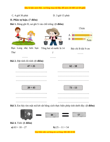 Bài 4. Tính: (1 điểm) a) 63 + 18 – 27 b) 25 – 11 + 54