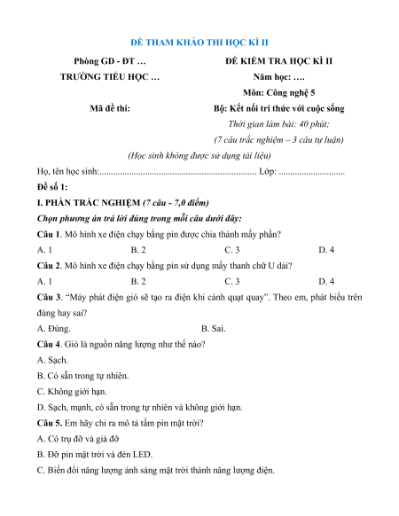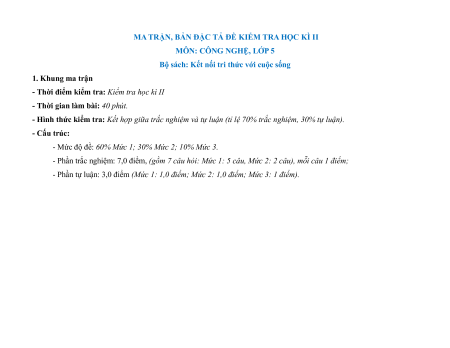 - Tailieugiaovien.com.vn giới thiệu bộ 5 đề Cuối kì 2 gồm đầy đủ ma trận và lời giải chi tiết môn Công nghệ lớp 5 Kết nối tri thức mới nhất nhằm giúp Giáo viên có thêm tài liệu tham khảo ra đề thi Công nghệ lớp 5.