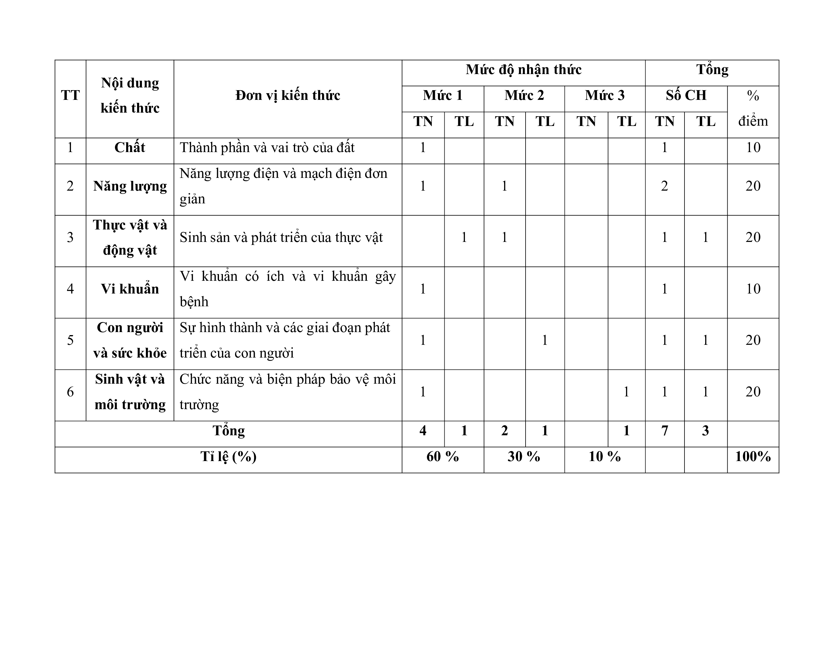 Đơn vị kiến thức Mức 1 Mức 2 Mức 3 Số CH % kiến thức TN TL TN TL TN TL TN TL điểm 1 Chất