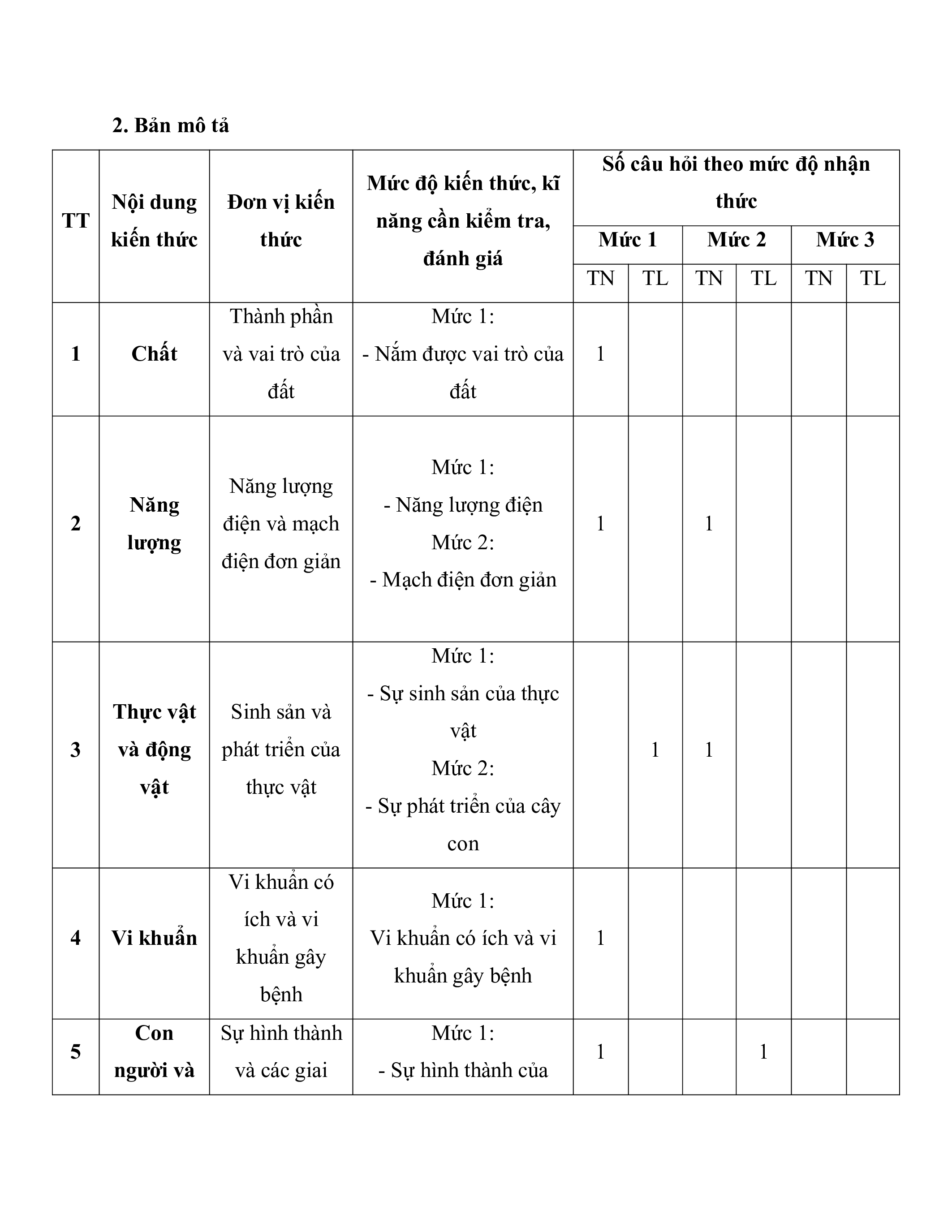 - Sự phát triển của cây con Vi khuẩn có Mức 1: ích và vi 4 Vi khuẩn Vi khuẩn có ích và vi 1 khuẩn gây khuẩn gây bệnh bệnh Con Sự hình thành Mức 1: 5 1 1 người và và các giai - Sự hình thành của sức khỏe đoạn phát con người triển của con Mức 3: người - Nam và nữ