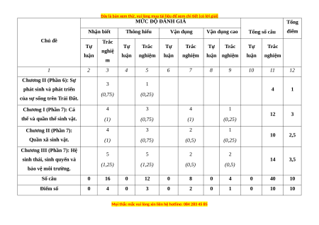 MỨC ĐỘ ĐÁNH GIÁ Tổng Nhận biết Thông hiểu Vận dụng Vận dụng cao Tổng số câu điểm Chủ đề Trắc Tự Tự Trắc Tự Trắc Tự Trắc Tự Trắc nghiệ luận luận nghiệm luận nghiệm luận nghiệm luận nghiệm m 1 2 3 4 5 6 7 8 9 10 11 12