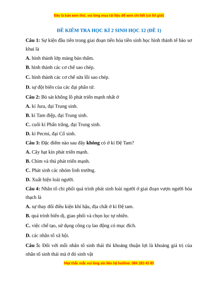 ĐỀ KIỂM TRA HỌC KÌ 2 SINH HỌC 12 (ĐỀ 1)