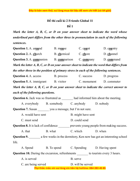Đề thi cuối kì 2 Friends Global 11 Đề 1