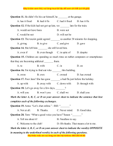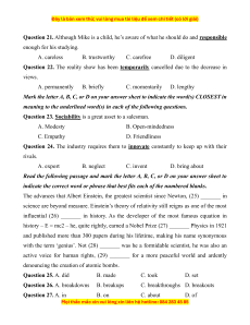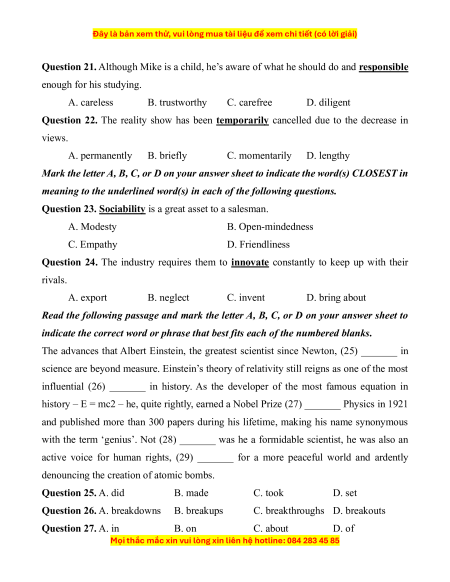 Question 21. Although Mike is a child, he’s aware of what he should do and responsible enough for his studying. A. careless B. trustworthy C. carefree D. diligent
