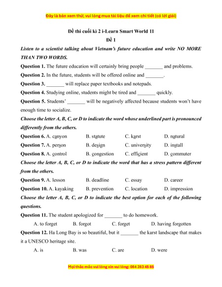 Đề thi cuối kì 2 i-Learn Smart World 11 Đề 1