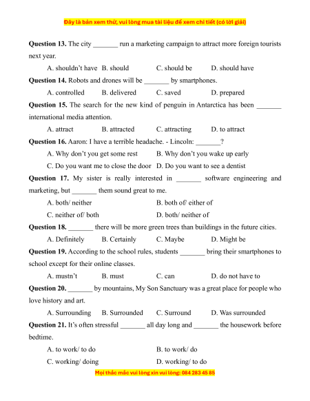 Question 13. The city _______ run a marketing campaign to attract more foreign tourists next year. A. shouldn’t have B. should C. should be D. should have
