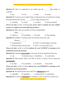 Question 20. _______ by mountains, My Son Sanctuary was a great place for people who love history and art. A. Surrounding B. Surrounded C. Surround D. Was surrounded