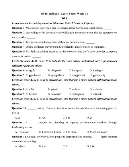 Đề thi cuối kì 2 i-Learn Smart World 12 Đề 1